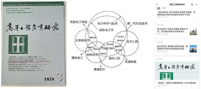 近日,我院朱先軍副教授、劉蕾蕾教授、郭艷東副教授和許吉副教授等人,在國內工程教育研究權威期刊《高等工程教育研究》上發表題為《交叉融合性新專業柔性電子學的課程體系建設》的教學改革研究論文。論文闡述了柔性電子學專業多學科交叉融合性的特點,著重介紹了我院在面向交叉融合的前沿學科需求,以學生為中心,以產業需求為導向、突出多學科交叉融合的特點、引入前沿技術進行柔性電子人才培養的課程體系構建和優化的思路,重點介紹了專業核心課程的特色和實踐教學環節設置,詳細介紹了傳統課程融合交叉學科特色的教學內容改革。柔性電子學是面向國家重大戰略需求的跨學科交叉融合領域設立的新專業,我校于2021年向教育部申報設立柔性電子學專業并成功獲批,于2022年9月招收第一屆本科生。我院柔性電子學專業師資隊伍建設、課程體系建設和學科發展等如火如荼的開展,并取得了良好實效。柔性電子學專業課程體系建設相關研究受到了《高等工程教育研究》期刊編委的青睞,刊發在2024年第3期“新工科研究與實踐”專欄,并作為選文在其公眾號上推廣,受到了國內高等教育界學者們關注。該教學研究成果得到南京郵電大學本科教改項目和江蘇省高等教育教學改革研究項目
